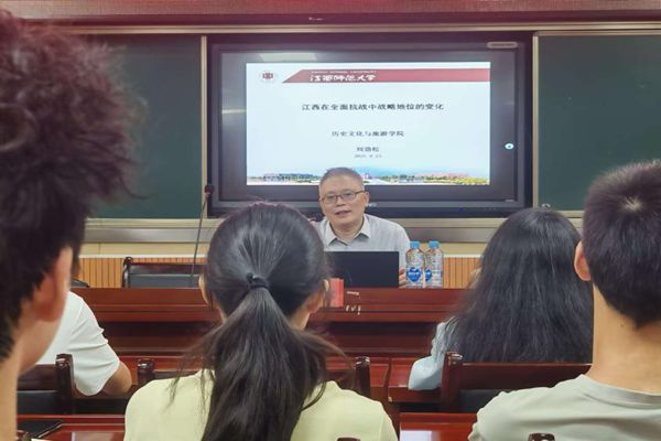为纪念中国人民抗日战争暨世界反法西斯战争胜利80周年,9月23日下午,豫章师范学院图书馆在二楼报告厅成功举办“提素质·强自信”系列读书分享活动首场讲座。本次活动特邀江西师范大学历史文化与旅游学院教授、博士生导师刘劲松,作题为“江西在全面抗战中的战略地位”的专题报告,带领师生深入回顾江西在全国抗战全局中的历史贡献与精神传承。