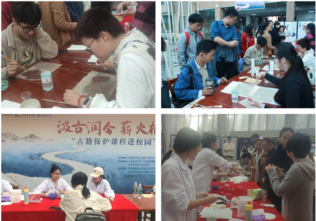 专题讲座结束后,师生至图书馆一楼大厅,参与体验古籍和陶瓷修复展示活动。我校考古文博学院师生系统介绍了陶瓷、古籍保护修复的类型方法、基本原则与流程步骤。同学们积极参与陶瓷和古籍修复体验环节,近距离感受修复技艺的精湛与匠心传承的温度。