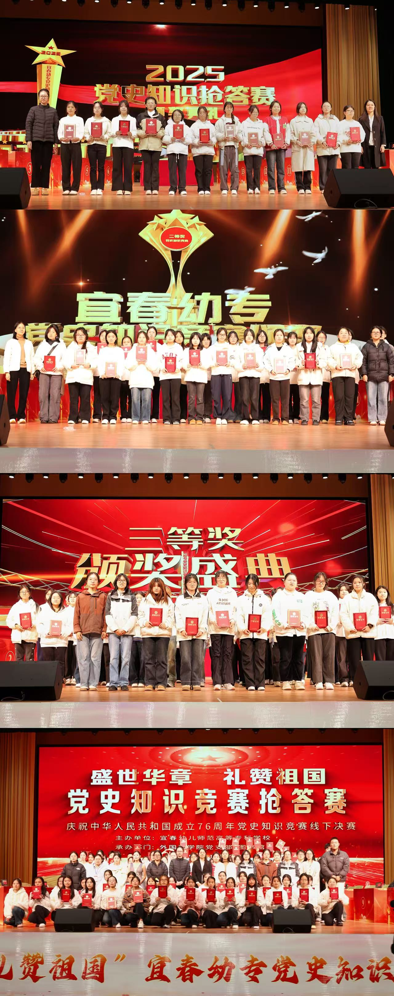 为深入推进党史学习教育走深走实,引导青年学子厚植爱党爱国情怀,11月20日晚,宜春幼儿师范高等专科学校图书馆和外国语学院党支部联合举办的“盛世华章 礼赞祖国”党史知识抢答赛决赛圆满落幕。